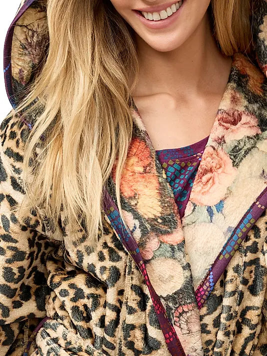 Johnny Was' Aditi robe reverses from a bold leopard print to a romantic floral and butterly design. This comfortable style features a hood and side patch pockets.