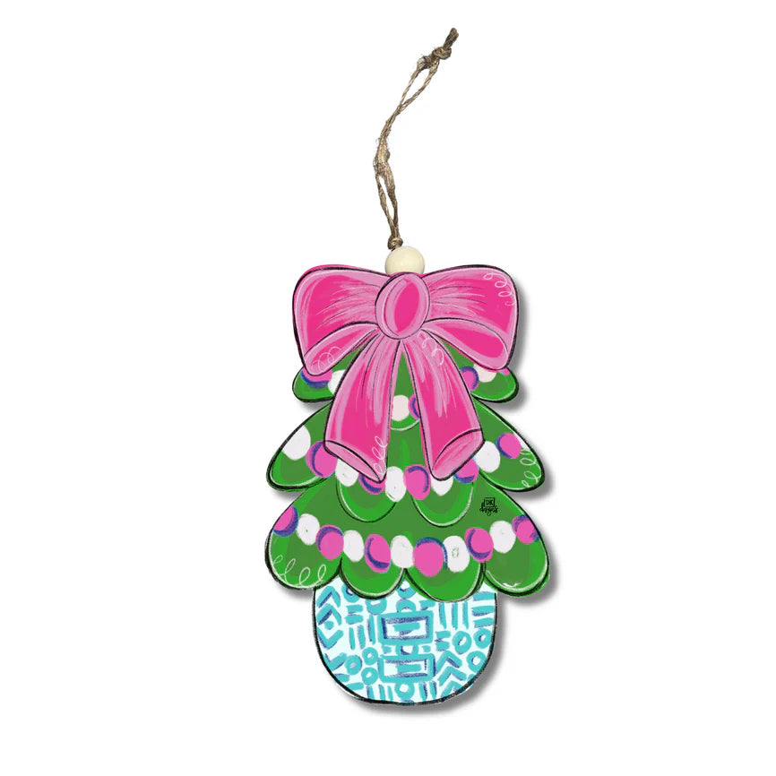 The Pink Bow Tree Ornament is a festive accent for any space! Show off your holiday style with a beautifully designed ornament featuring a festive tree decorated in pink garland and a pink bow with a Chinoiserie pot.