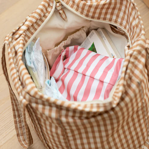 - The waterproof Wet Bag has a front zipper pocket for bib + placemat and a back zipper pocket for food and snacks.