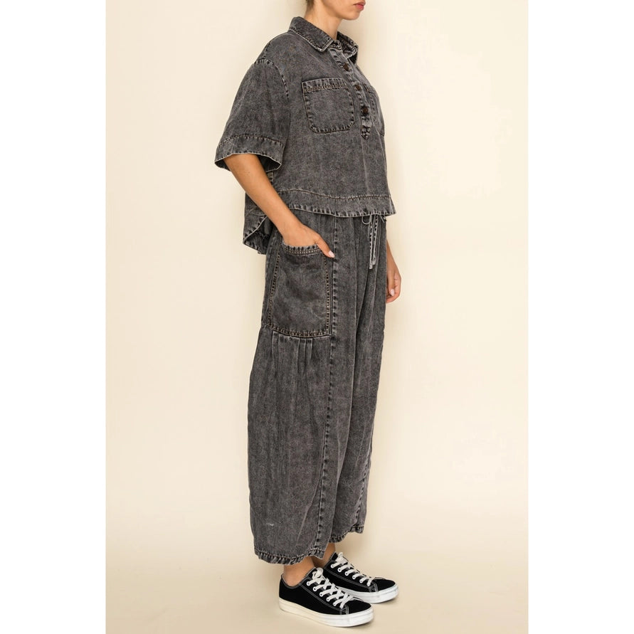 This pair of soft washed pants offer a soft, naturally washed look with an ultra-comfortable drape. Designed in a modern balloon silhouette, they feature an easy pull-on waistband, adjustable drawstring, and oversized utility cargo pockets. The breathable Tencel fabric keeps you cool, while the wide-leg shape adds effortless movement and a contemporary edge.