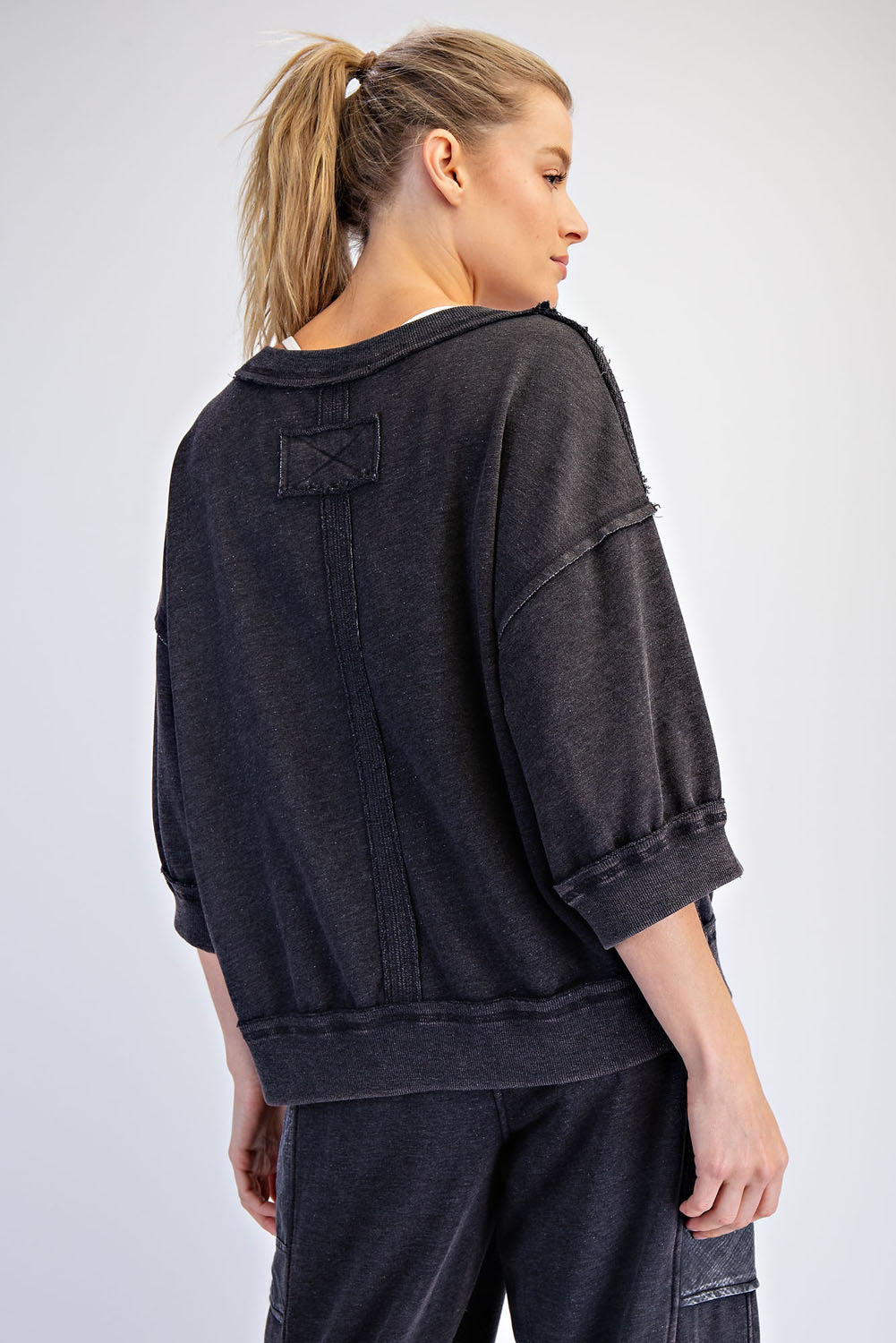 Throw on The Etta Top and embrace that effortlessly cool vibe. This mineral-washed French terry beauty features a deep boat neck, dropped shoulders, and oversized short sleeves that scream relaxed luxury. The loose, drapey silhouette with raw-edge details gives you that perfectly undone aesthetic—like you just rolled out of bed looking amazing. Breathable and lightweight, it's your new go-to for days when you want to look put-together without actually trying. Pure, understated style.
